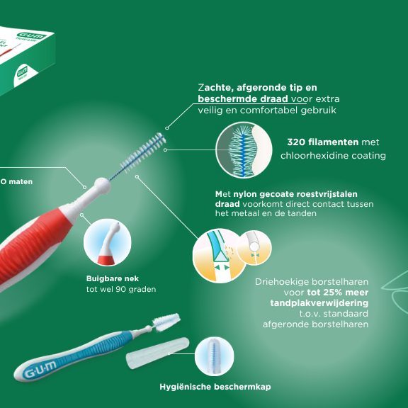 GUM TRAV-LER interdentale ragers zijn ontwikkeld voor optimale plaqueverwijdering in de interdentale ruimte, met een sterke focus op gebruiksgemak en patiëntcompliance. Het innovatieve ontwerp met driehoekige borstelharen zorgt voor tot 25% meer tandplakverwijdering ten opzichte van traditionele afgeronde filamenten.